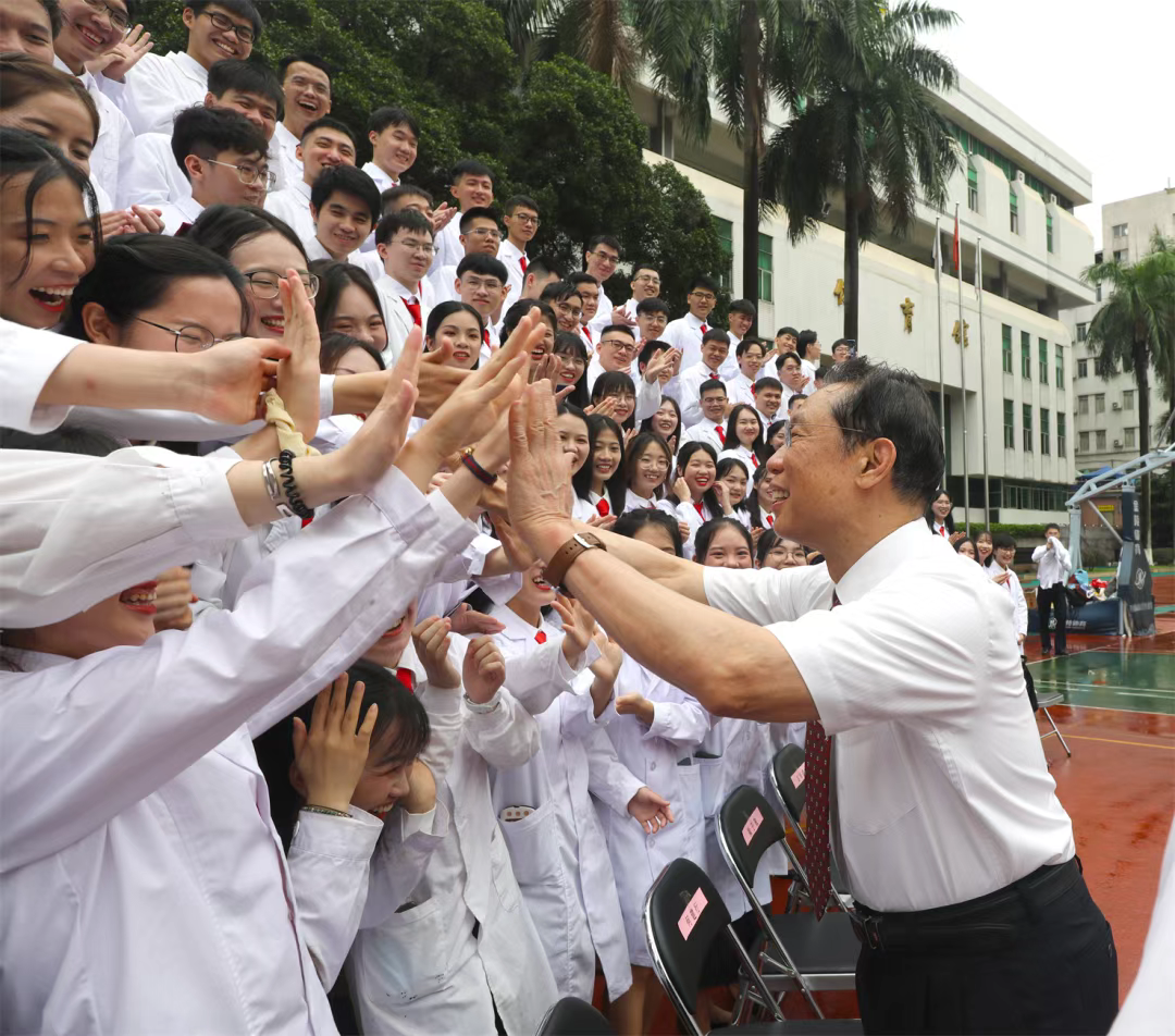 “英雄不问出处。50余年前,广医附一院几乎是广州最小的医院,但是经过前辈们的艰苦奋斗,附一院一步一个脚印,逐渐变大变强。希望同学们以后常回家看看!”钟南山院士说。随后,他与毕业生们击掌、合影,送上祝福。
