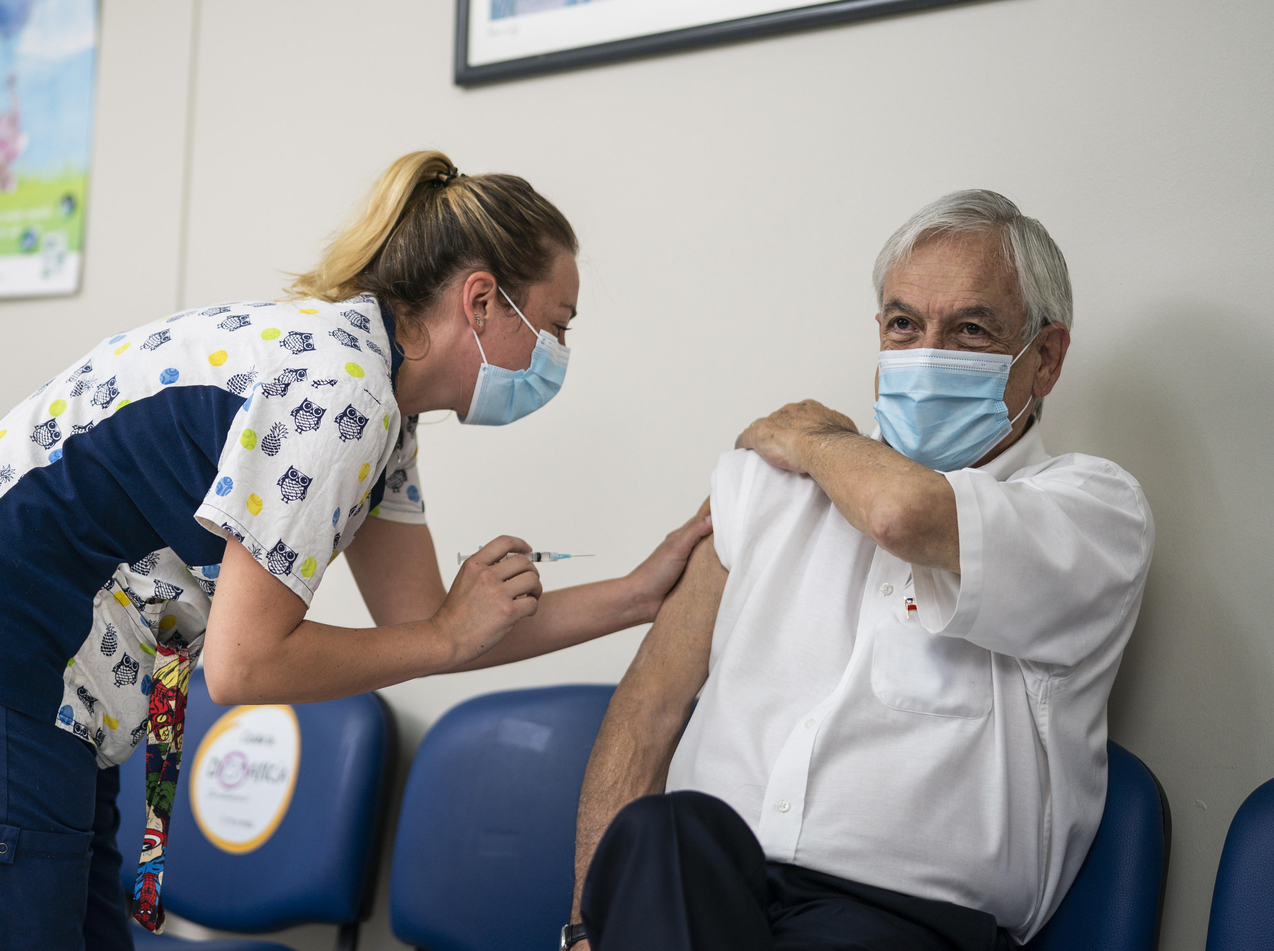 2021年3月12日,智利总统皮涅拉(右)在首都圣地亚哥一家医院接种第二剂中国科兴公司研发的新冠疫苗。新华社发(智利总统府供图)
