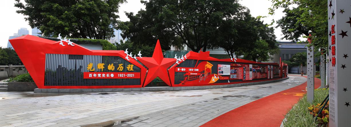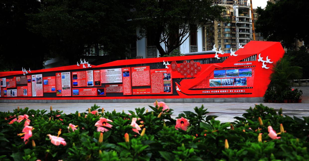 红色文化线路贯穿公园主入口至出口,长达500米的线路上布置了党建文化景墙、党旗雕塑等红色元素,同时配置了夜景灯光。