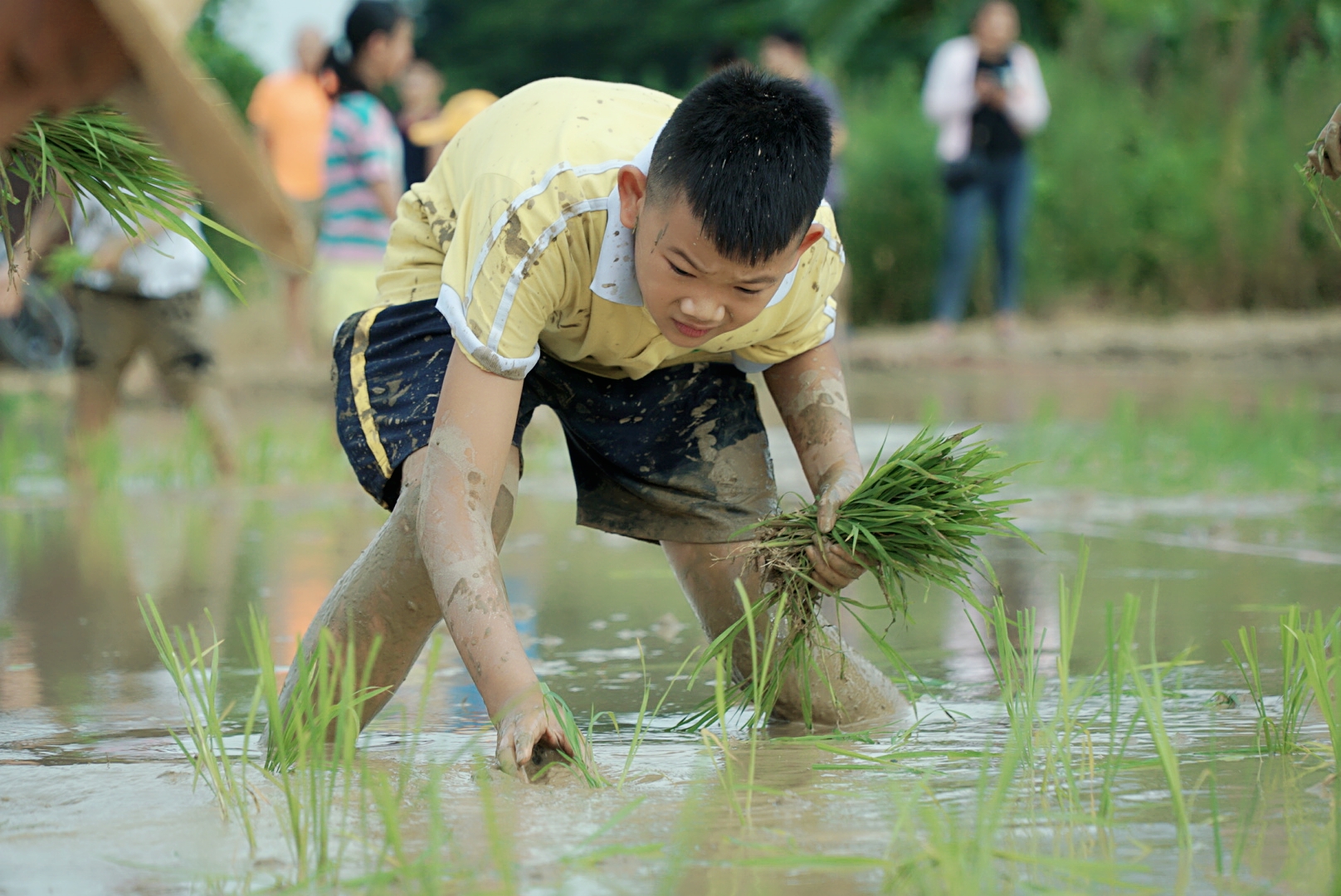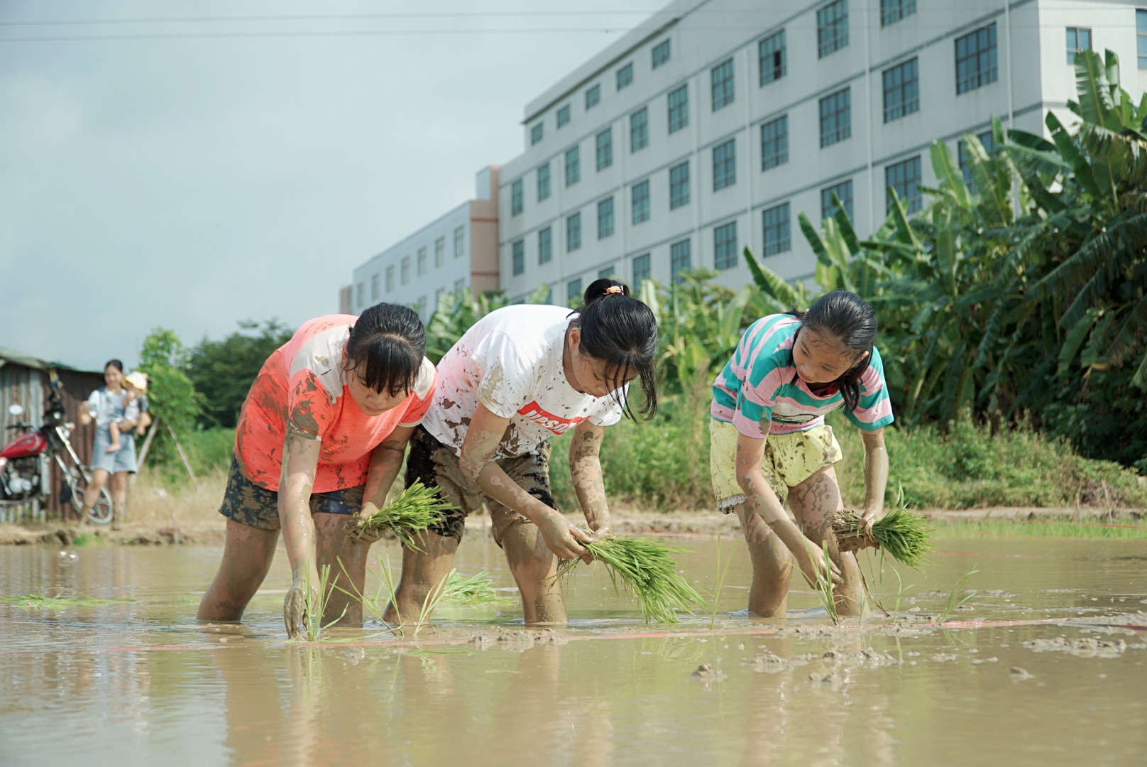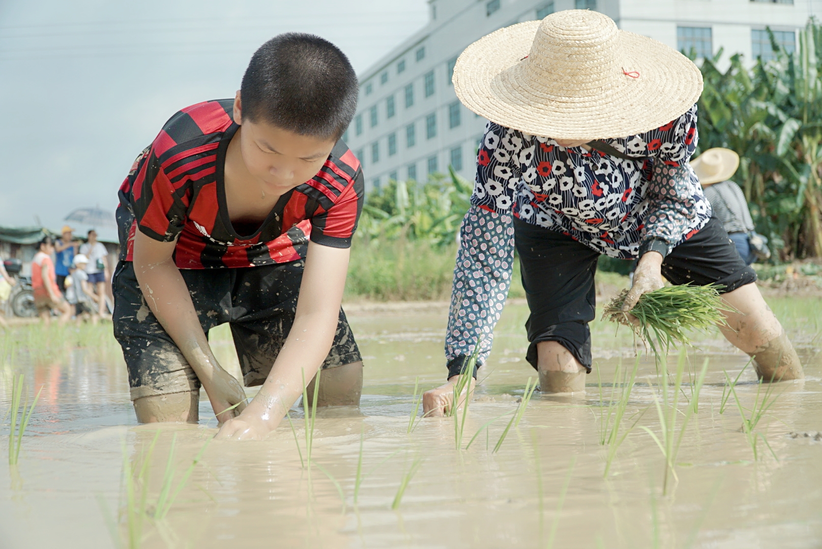 孩子们兴奋极了,挽起裤脚,光着脚丫,手握秧苗,在水田中边移动脚步,边跟着家人认真插秧,全然不顾酷暑暴晒。他们热得汗流浃背,也干劲十足,在实践中体会到劳动的艰辛与快乐,深刻领悟到了“粒粒皆辛苦”的道理。