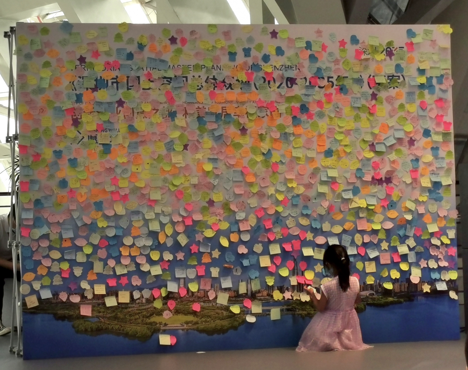 “想在深圳有套房,不用再为实现‘居者有其屋’烦恼”;“希望轨道建设加快,地铁早日通到家门口”;“希望‘生态之城’能看到越来越多的小动物”;“改善医疗与教育,愿深圳早日成为民生‘七有’的幸福之城”……一张张五颜六色的便笺条,写着市民对2035年深圳的美好期待,贴满了“两馆”场内设置的心愿墙。