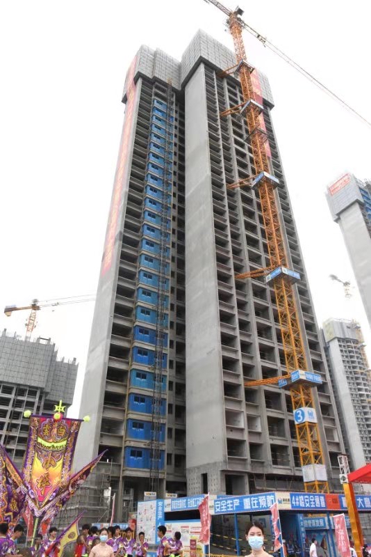 本次封顶的5号楼建筑总面积14612.9平方米,楼高97.95米,地上31层,地下2层。项目2020年5月10日开工,9月27日基础及地下室结构完成,施工至正负零;2021年6月23日顺利完成主体结构封顶,现正同步进行砌筑施工及精装施工。园林工程及周边市政道路工程下个月动工,计划2021年年底达到交付条件。