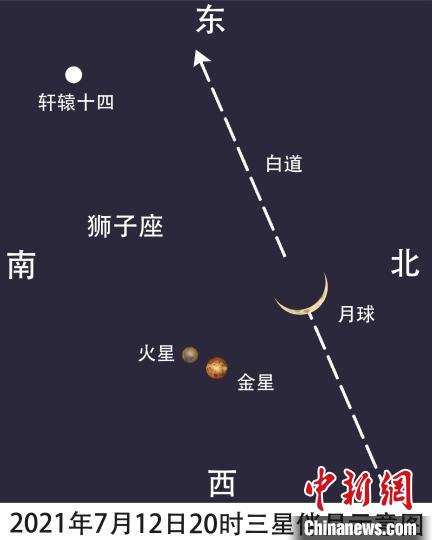 据广州市五羊天象馆透露:7月12日,夕阳西沉,夜幕降临,天穹将上演少见的三星伴月奇观,弯弯的蛾眉月与金星、火星和“轩辕十四”近在咫尺,呈现有趣的景象。如果天色晴朗,中国各地连续两晚(12日、13日)均可观赏到这一罕见的天象。