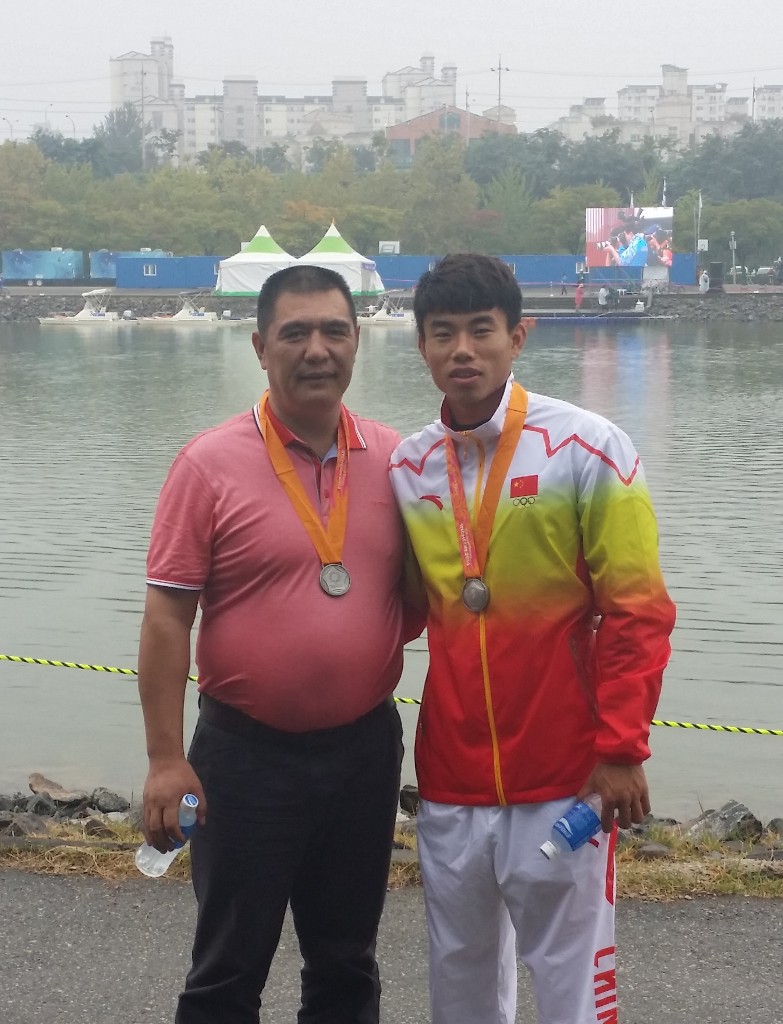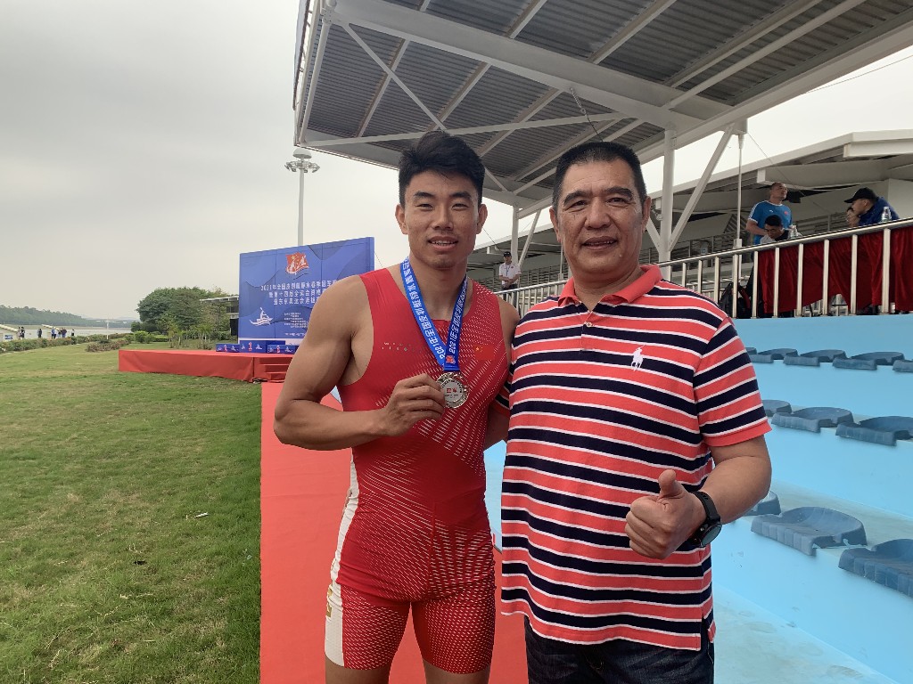 在2021年全国皮划艇静水春季冠军赛上,郑鹏飞(左)与启蒙教练毛国斌合影(受访者供图)