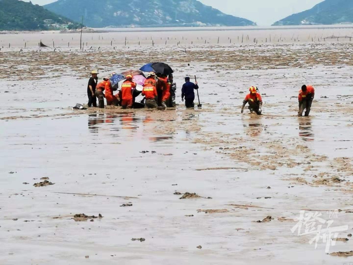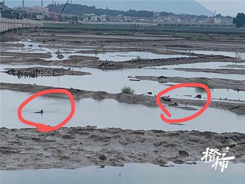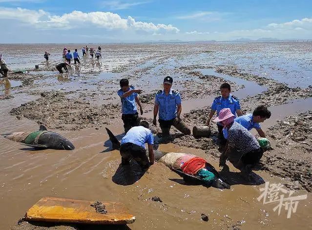 7月9日,宁波宁海西店镇樟树村滩涂,2头糙齿海豚(海豚是小到中等尺寸的鲸类)搁浅。