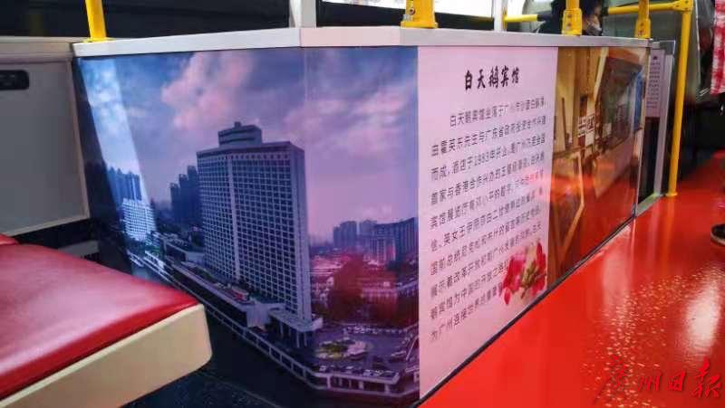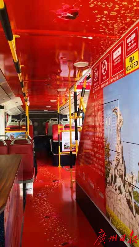 记者看到,这辆观光巴士的车身写着“英雄广州城 魅力党旗红”,车厢内则设有红色景点介绍并装点以木棉花图案。