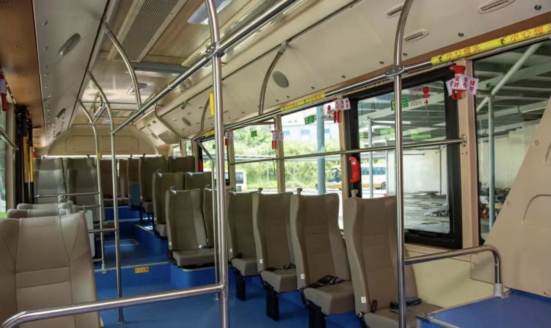 步入车内,内饰色调清新自然,驼色的皮座椅柔软舒适,浅米色的仿木纹天花高端大气。车上搭载的两块高清液晶屏为首次出现在邨巴上,在繁忙的早晚高峰可以缓解乘客心情,及时了解社区资讯和动态。