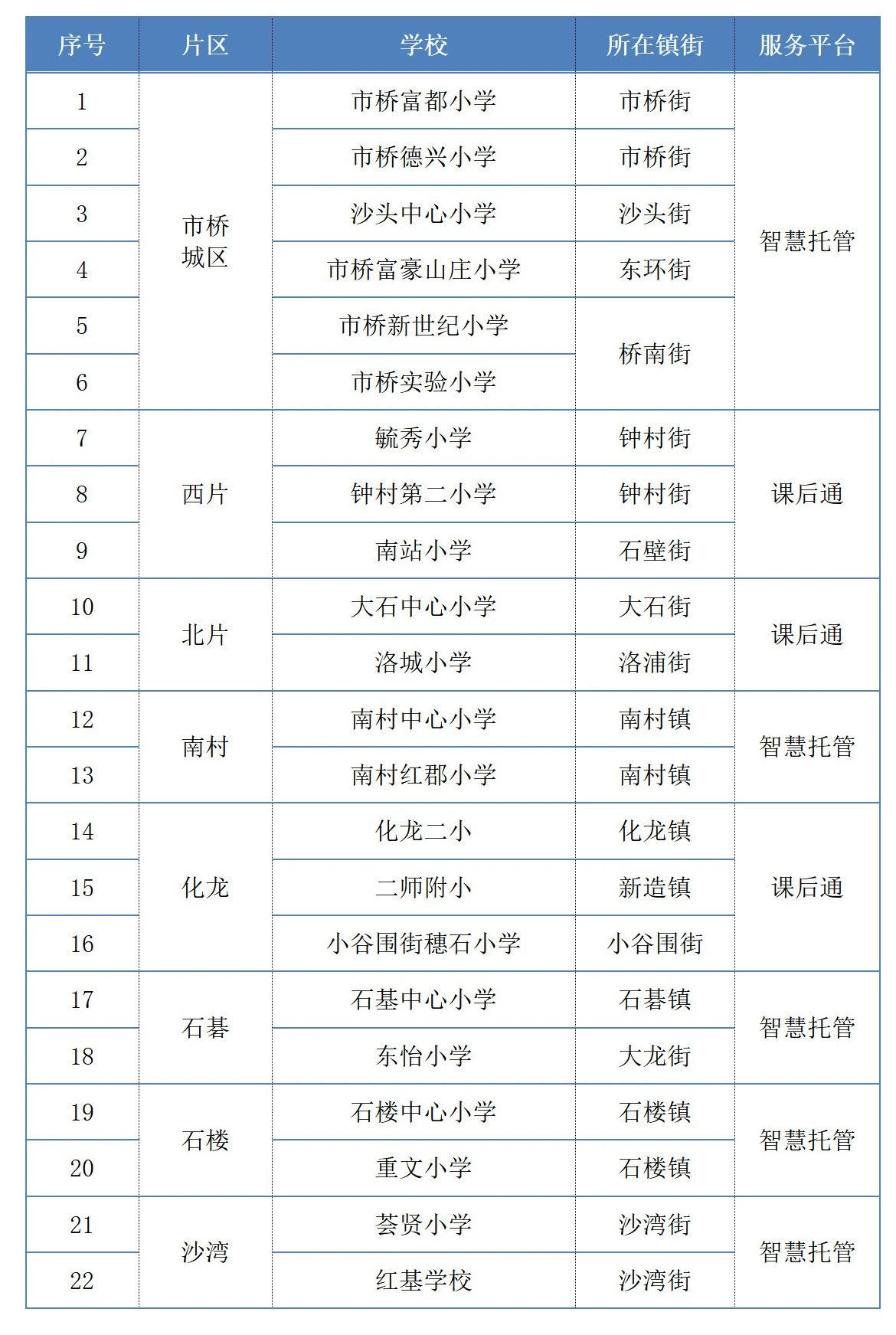 番禺区开展暑期校内课后服务试点学校名单。暑期校内托管服务将从今年7月19日开始,至8月20日结束,分两期开展,且不含周末。第一期为7月19日至8月3日,第二期为8月5日至8月20日。每日服务时间为工作日8点30分至18点结束,共分三个时段:上午时段8点30分至12点,午托时段12点至14点30分,下午时段14点30分至18点。家长可自愿申请参加其中一个或多个时间段。