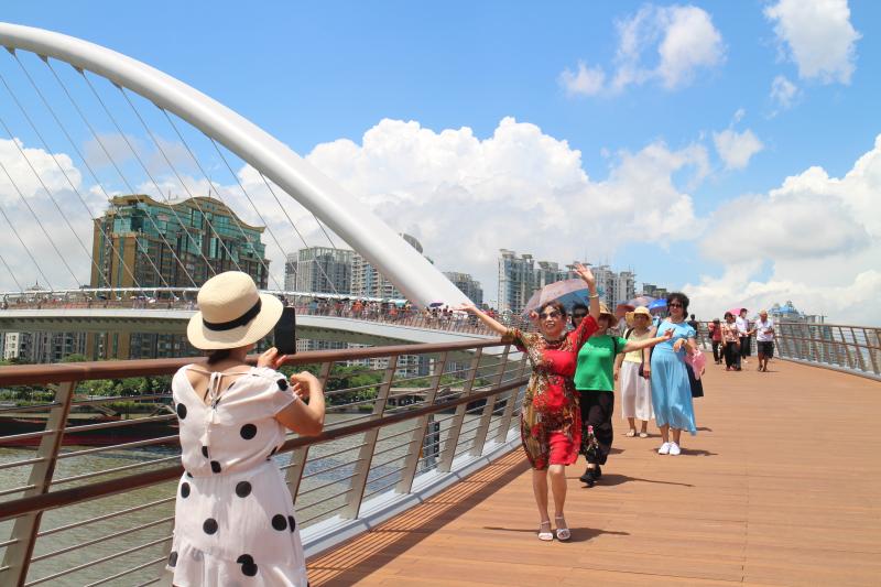 记者近日走访发现,前来海心桥打卡的市民络绎不绝,其中不乏中老年姐妹团、一家人、亲朋好友、情侣、摄影爱好者等人群,这座“颜值”高、满满“技术范”的人行桥吸引市民花样打卡。