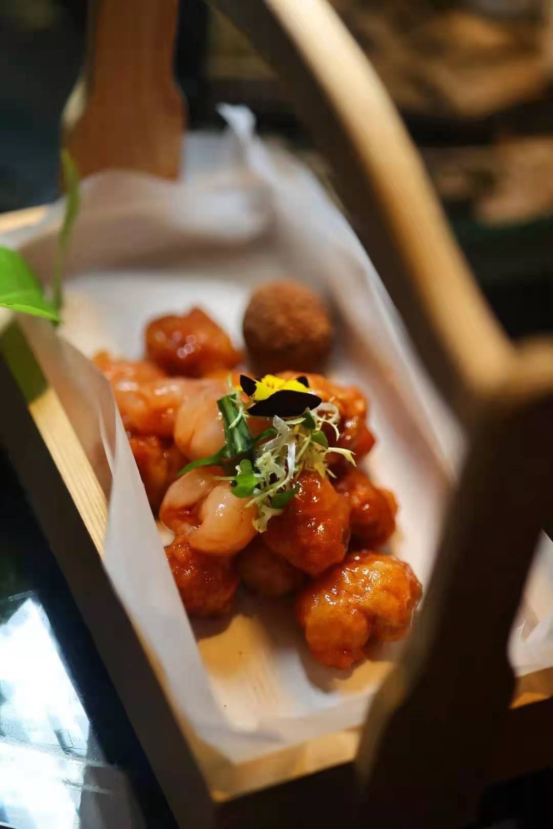 吴师傅采用的是妃子笑荔枝,荔枝在此还有另一用处,制成荔枝汁。吴师傅说,如果荔枝汁直接加热,容易流失香味,因此,他将浸开的干松茸浸于荔枝汁中,让汁液附着于表面,松茸的菌香气叠加荔枝汁的水果香,再稍微煎一煎,则能更好融合。这道菜的主角除了荔枝,还有同样色调的带子,用自制的xo酱煎过以后,配以双色拌汁。所谓双色拌汁是黄色的法国芥末酱和绿色的牛油果酱。自制的xo酱是由香茅、火腿、瑶柱、干葱、蒜蓉、干辣、酸紫天椒、肉丝和xo酒调制而成。这道菜,市民居家可以轻松做到。所有材料都能从市场或者电商平台上购买到。