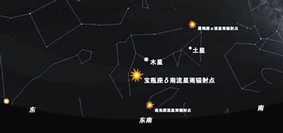 宝瓶座δ南流星雨的辐射点将在当地时间7月30日21时10分升出地平。当天是农历六月廿三,下弦月会在半夜升起,带来干扰,我们可以选择在前半夜观测。
