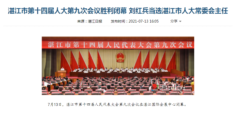 7月13日上午,湛江市第十四届人民代表大会第九次会议在湛江国际会展中心闭幕。会议以无记名投票方式,选举刘红兵同志为湛江市第十四届人民代表大会常务委员会主任。