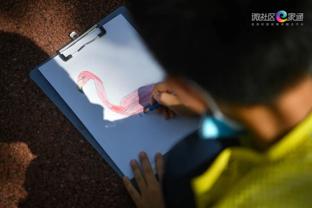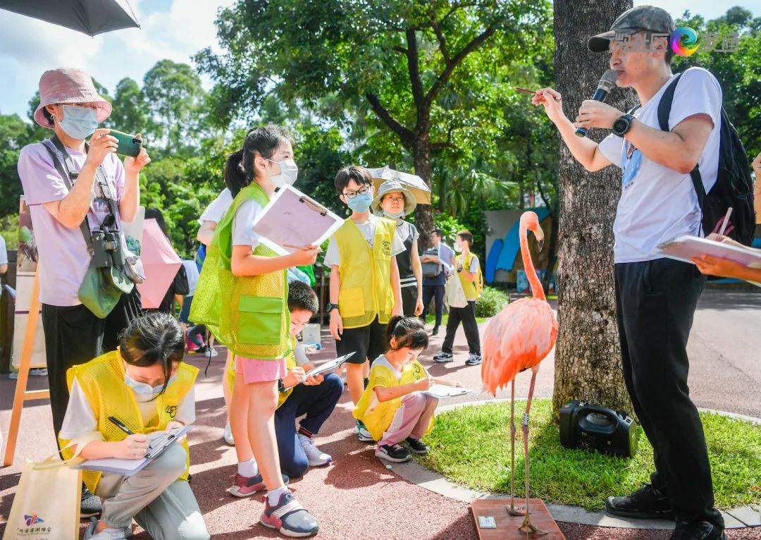 “大家看到火烈鸟的羽毛是粉红色的,但你又知不知道原来它的颜色是吃出来的?”7月11日上午,广州动物园内的仙鹤湖旁侧广场上,20组亲子家庭在自然导师的带领下,或通过望远镜观察湖中的火烈鸟动作神态或边看着火烈鸟的标本边根据导师的讲解,把其临摹在画纸上。