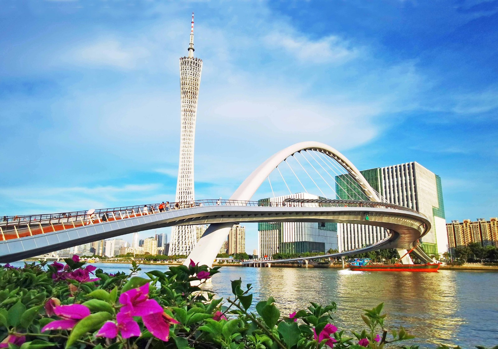 蓝天下簕杜鹃绽放,海心桥与小蛮腰互相呼应。(摄影:王永芝)