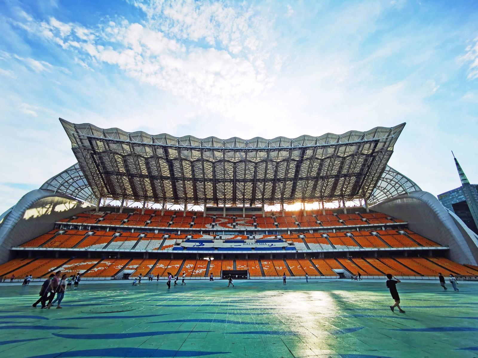蓝天映衬下的海心沙看台别具一格。(摄影:王永芝)