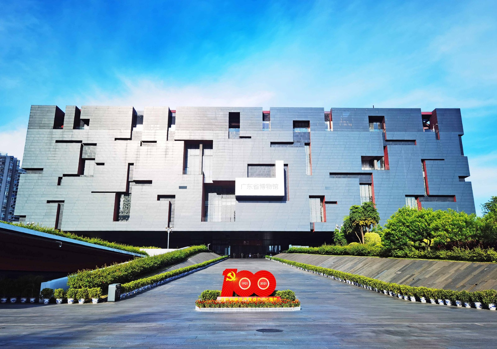 广东省博物馆在蓝天下显得特别静谧。(摄影:王永芝)