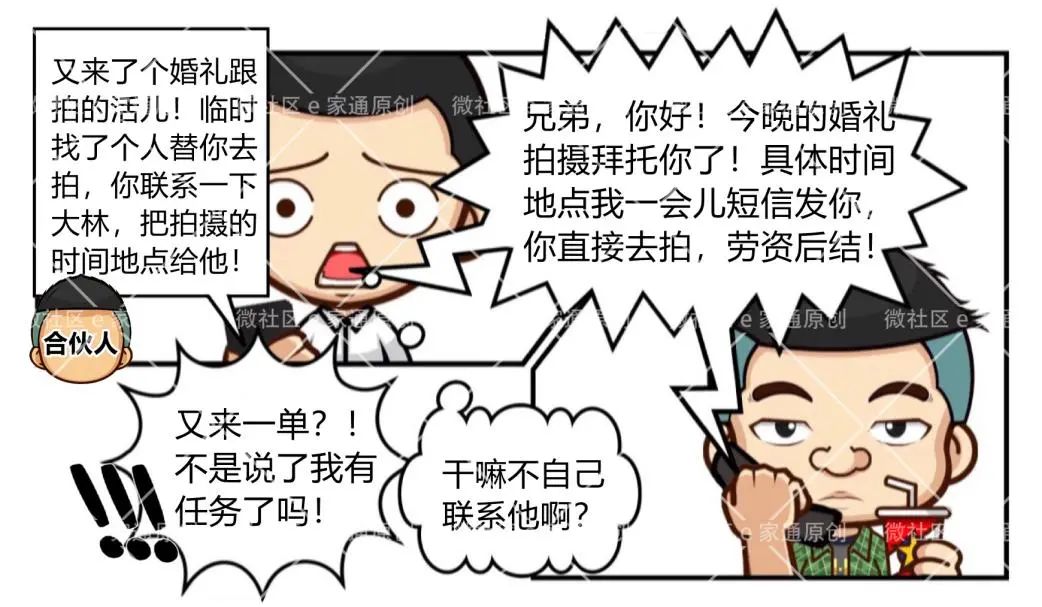 这天,合伙人洽谈了一宗婚礼跟拍的业务,但小农已有其他拍摄行程安排,合伙人便临时雇用了另一名摄影师大林负责这宗婚礼跟拍的业务。