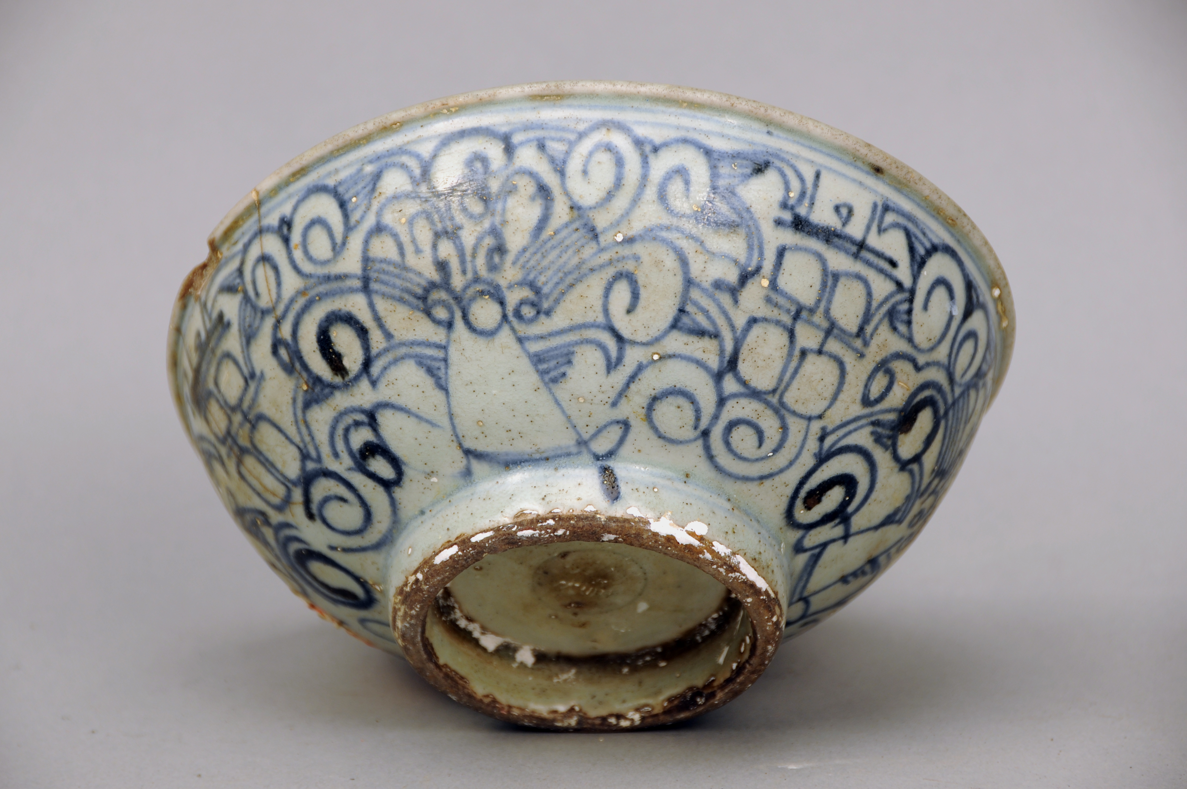 底色蓝偏白,绘深蓝色花纹图案,内有一用针刻成、约2厘米大的“秀”字,碗周边有5条裂痕,边沿有缺口。这是彭湃同志在广宁从事农民运动时用过的碗。