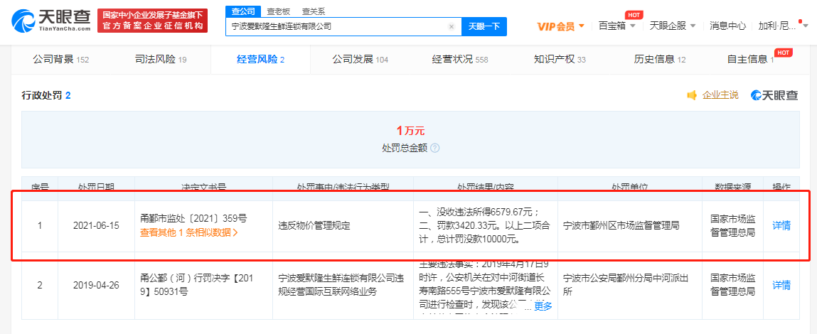 宁波市鄞州区市场监督管理局认定,该行为违反了物价管理规定,对其没收违法所得6579.67元,罚款3420.33元。以上二项合计,总计罚没款10000元。