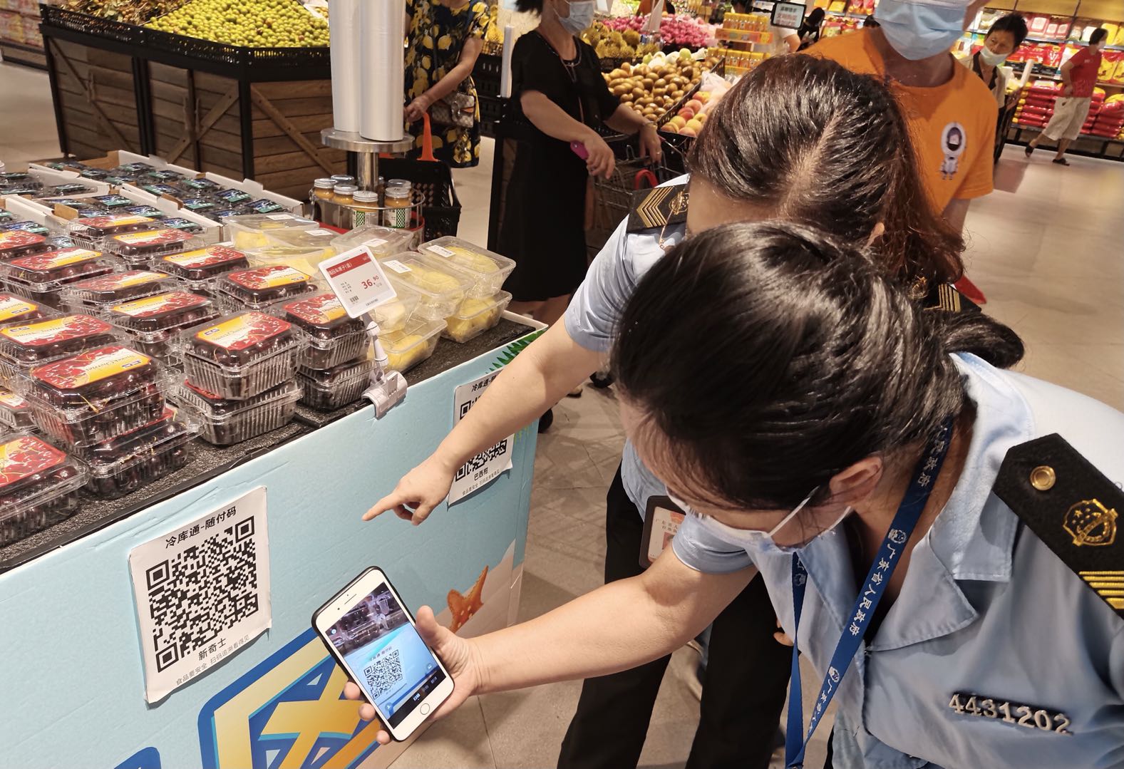 “‘随附追溯码’就像我们的‘健康码’一样,每一个消费者都可以通过扫码,查到在这个商超里每一批次进口冷冻肉制品和水产品的‘行踪’、‘证件’”。工作人员提醒,消费者可使用微信或支付宝扫一扫进口冷链食品的“随附追溯码”,查询产品信息和相关凭证情况,发现不相符的,可立即拨打12345向监管部门举报。