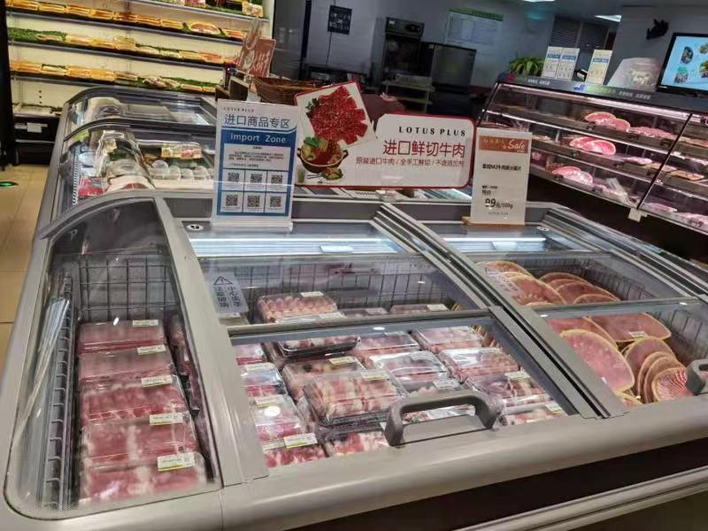 探访首站是位于白云区的安华汇卜蜂莲花超市,该超市约有两成冷链食品是从境外进口的,每一批次的食品都会经过核酸检测、消毒等,方可进入销售环节。在超市冷冻柜前进口食品专区可见,每个进口食品的价格牌上均挂有一个二维码牌,写着“食品要安全,上面是冷库通的‘随附追溯码’”。