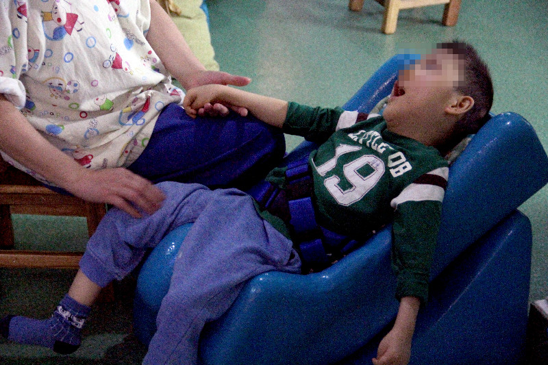 走进孩子们的房间,孩子们或安静地躺在躺椅上好奇地观察新来的“陌生人”,或伴随着身旁音响中的音乐翻滚着表达着自己的情感,或正在被护理员阿姨按摩手掌、小腿等,感受着阿姨的“爱”。