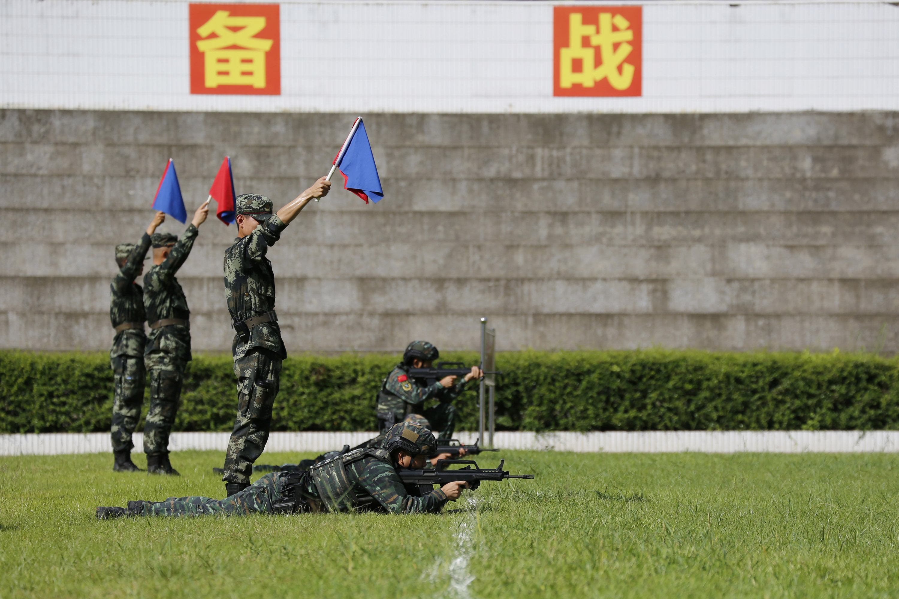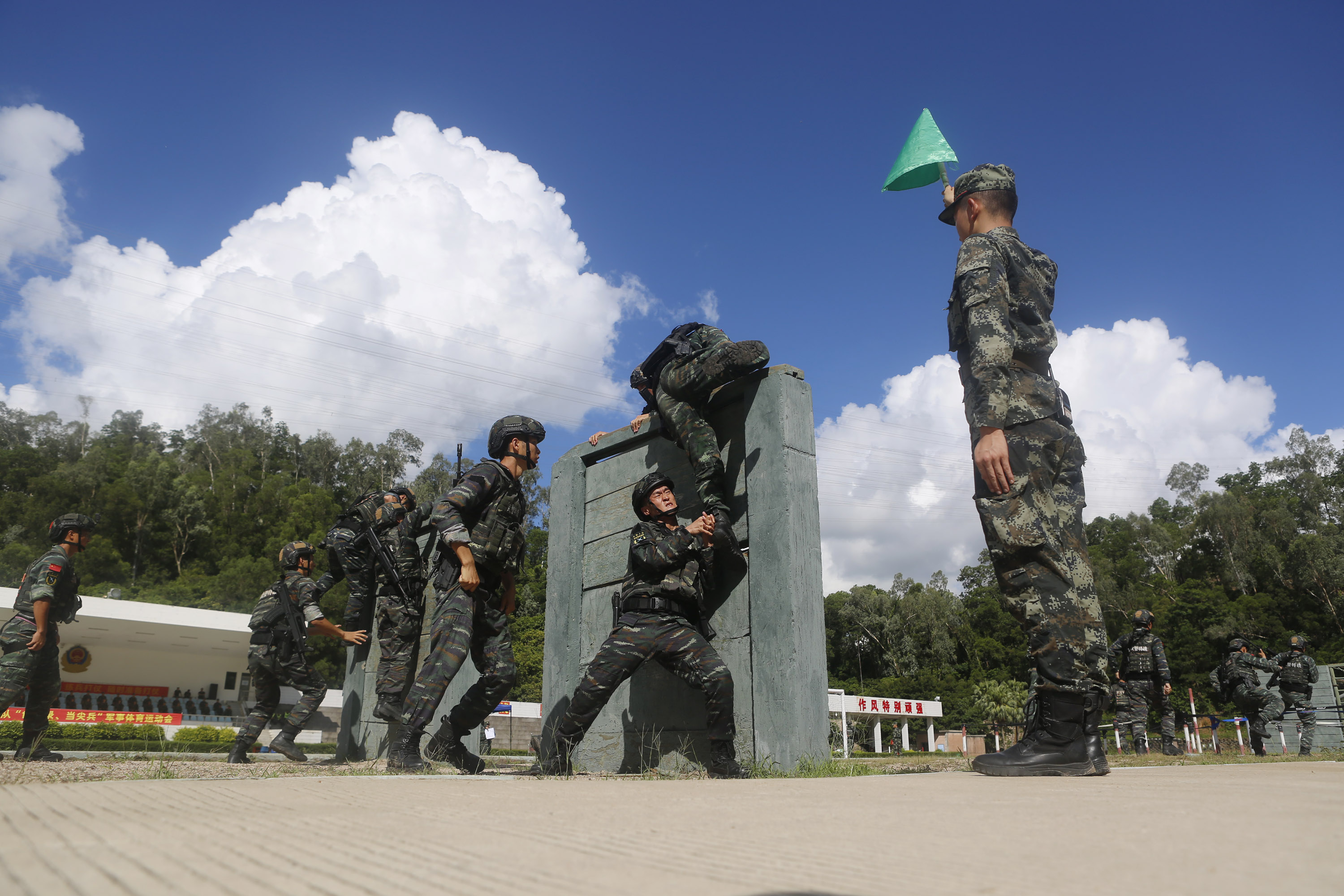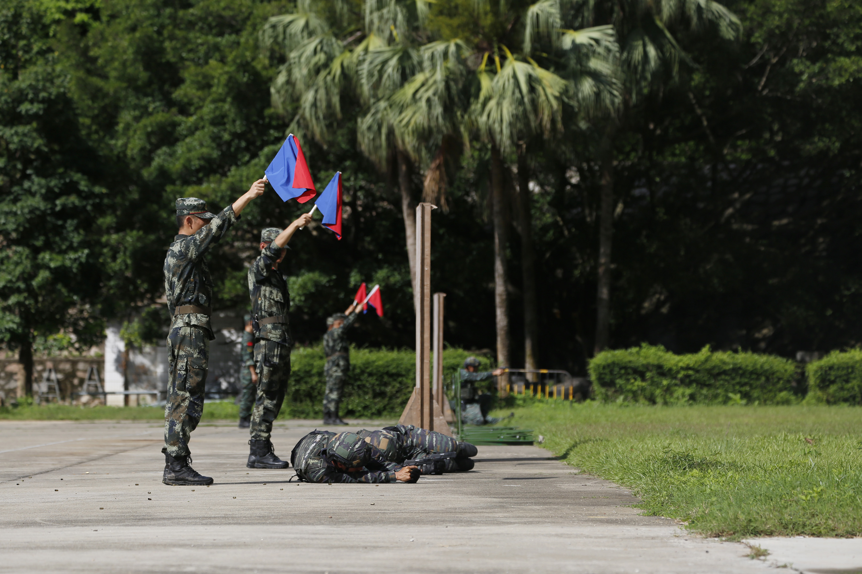 7月15日,武警广东总队执勤第二支队特战队员迎着高温酷暑,头顶烈日,在深圳银湖山脚下开展班组对抗射击训练,利用极端天气模拟实战场景开展比武竞技,有效锤炼了特战队员在陌生地域、复杂环境下的快速适应、突击、作战能力。