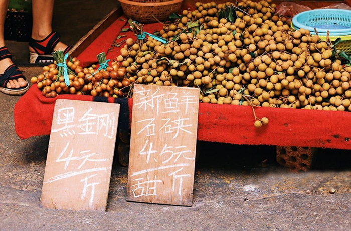 南宁市秀厢菜市一家水果摊售卖的黄皮果和龙眼。李轩然摄