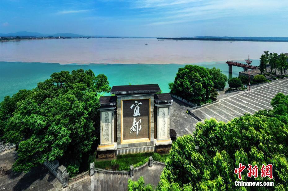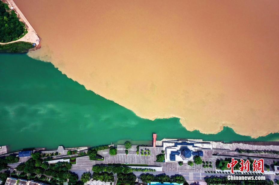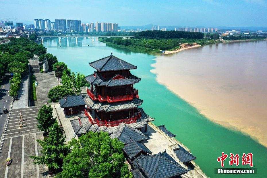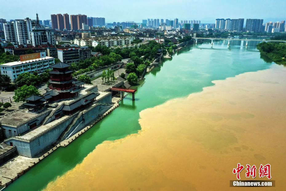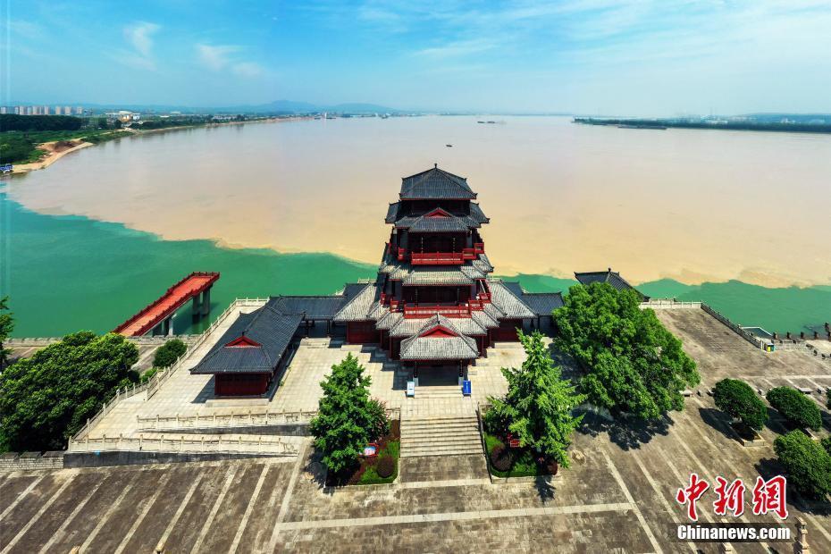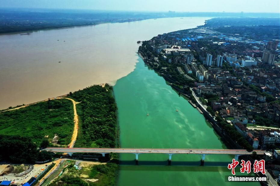 7月15日,长江湖北宜都段出现奇特的“清浊分明”景观。连日来,受长江上游持续降雨影响,长江水与清江在宜都市境内交汇,形成了泾渭分明的奇特景观。清江是长江一级支流,全长423公里,古称夷水,因“水色清明十丈,人见其清澄”而得名。