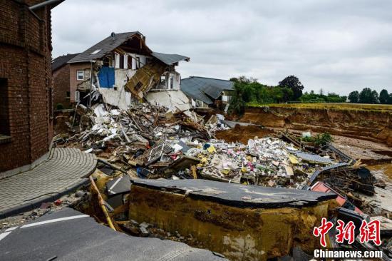 当地时间7月16日,德国Erftstadt-Blessem,一条被洪水侵袭后的街道。