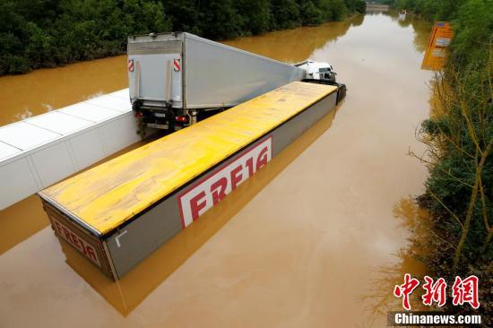 当地时间7月16日,德国Erftstadt,大雨过后,卡车困在被洪水淹没的街道上。