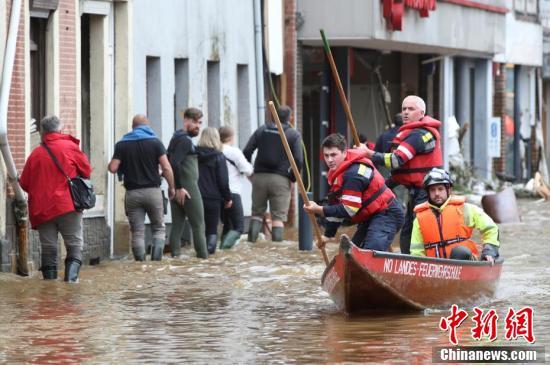 当地时间7月16日,比利时Pepinster,救援队队员撑船穿过受洪水侵袭的地区。