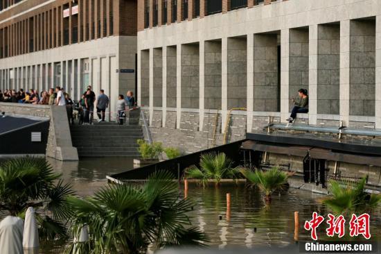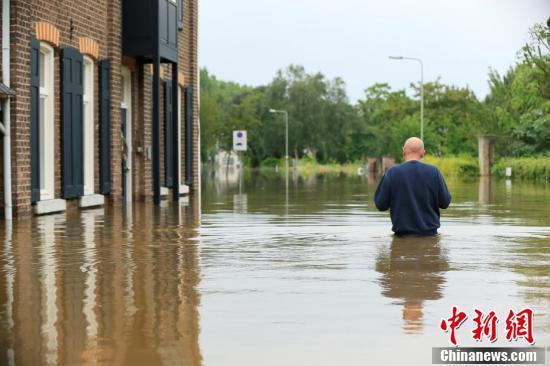 当地时间7月16日,荷兰Venlo,Maas河水位持续上涨,人们聚集在没被淹没的地方。