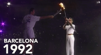 ▲1992年巴塞罗那奥运会,两届残奥会射箭奖牌获得者雷波洛用火种点燃箭头,准确地射向70米远、21米高的圣火台。