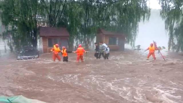 一夜暴雨后,7月18日清晨,北京市延庆区珍珠泉乡水泉子村山洪暴发,河水猛涨,3名男子被困水中,抱住一棵大柳树求生。延庆消防指战员到场后,利用绳索、橡皮艇进行施救。经过4个多小时的营救,3名男子成功脱险。