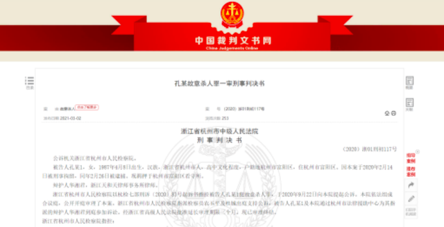 2021年1月12日,浙江省杭州市中级人民法院作出判决如下:被告人孔某犯故意杀人罪,判处无期徒刑,剥夺政治权利终身。