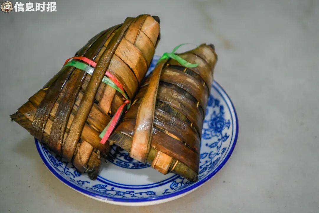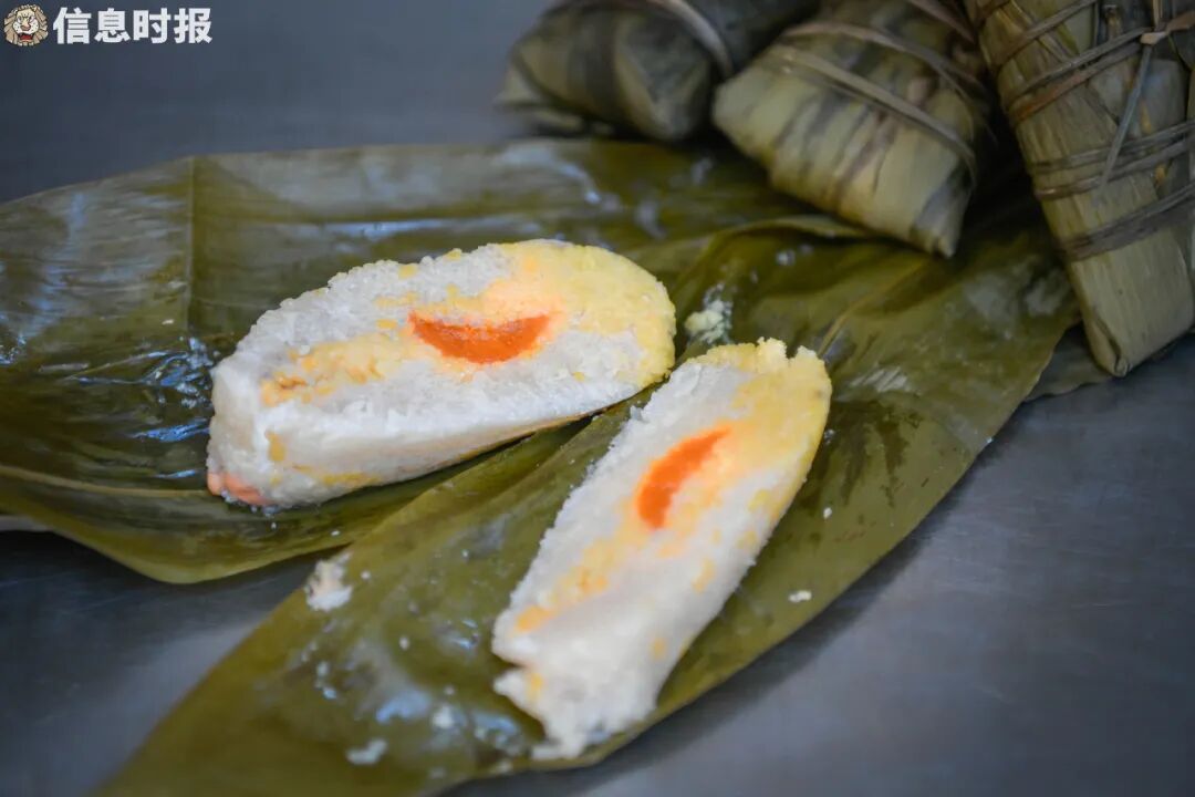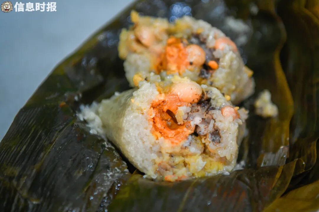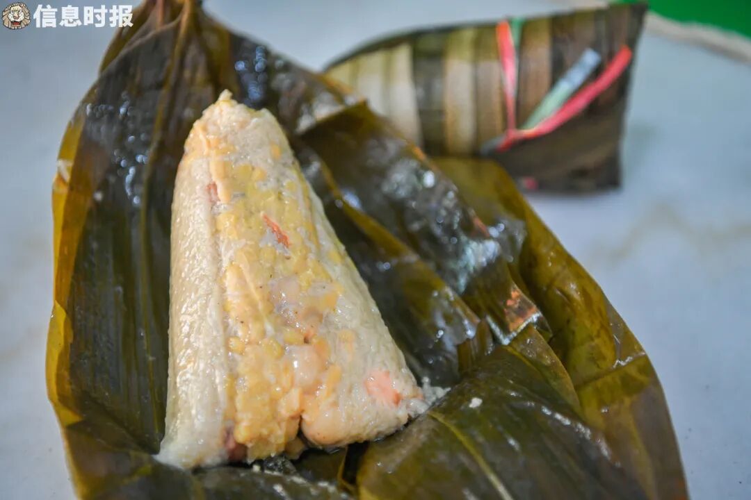 别看台山粽不算大只,约为成年人拳头大小,但其实分量特别实在。糯米被粽叶裹得严严实实的,扎实得连四角都有点扭曲了。“所以,台山粽又叫‘扭角粽’,和平四角形的广式粽、隆起尖五角形的肇庆粽大不相同。”在台山当地,家家户户包的台山粽口味都有差别。胡玳珊为了让粽口感更粉糯,除了绿豆花生外,还加入眉豆,并且用虾米粒提鲜。记者迫不及待试了一口,五花肉的猪油香气中,夹杂着虾米香,果然惹味;眉豆花生口感粉糯起沙,实在很难让人不爱上它。