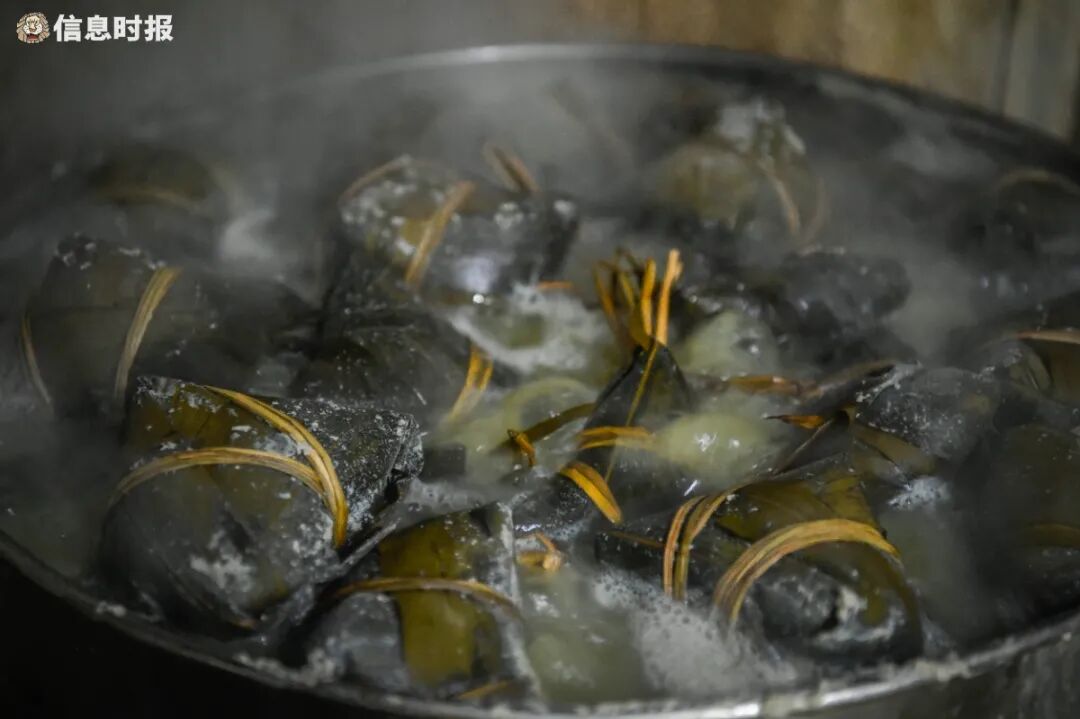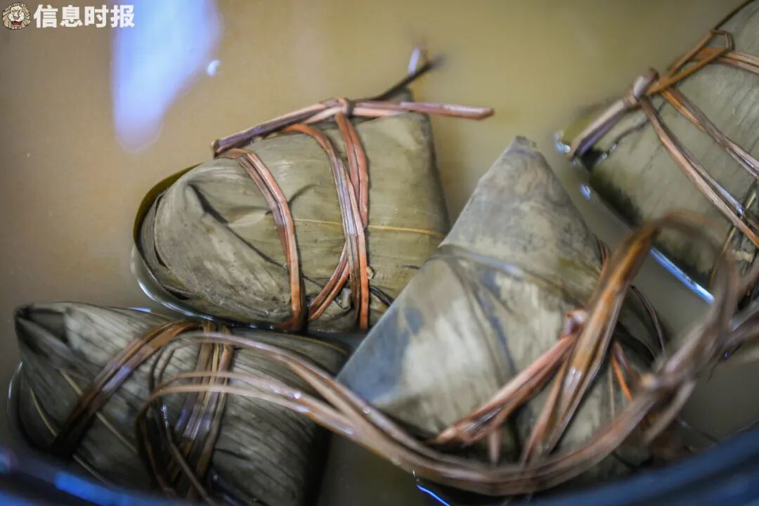 不过,判断其是否是正宗的台山粽,除了口感和形状外,馅料里是否加入“红榄”才是关键。据悉,除了绿豆、咸蛋黄、花生等基础食材外,加工五花肉时需要加入“红榄”腌制。“将红榄洗干净切碎,将五花肉腌入味,不仅能让花肉更香,颜色也会更好看。”罗建忠说。喜欢吃粽子的人虽然不在少数,但也有很多人对粽子里面的五花肉“敬而远之”。为了减轻五花肉的油腻感,罗建忠说,他们煮粽时,还会特意放入艾草和菖蒲。