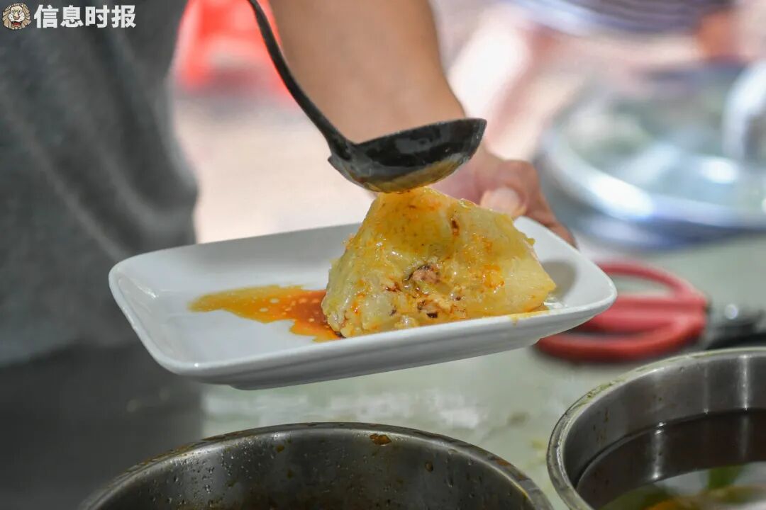 只见罗建忠用老广吃肠粉的方式,先在粽身上淋上一层香油,再淋上一勺肠粉豉油,他说:“这样能让粽子更加‘和味’,让粽子的香味提升一个档次。”趁热夹起一筷子,口感果然饱满扎实,颇有点像煎香过的粽子般,又香又糯。