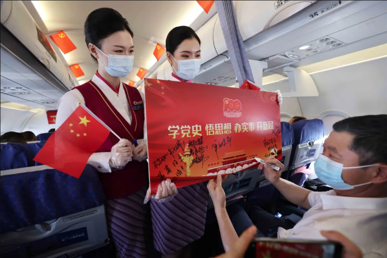 飞机上,南航集团在北京、新疆、上海等多个分子公司开展“党的精神进客舱·党的声音上蓝天”等13个主题航班活动,让红色旋律在云端“高歌”。