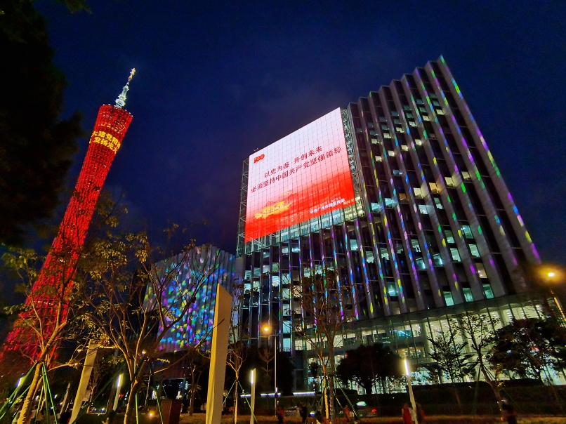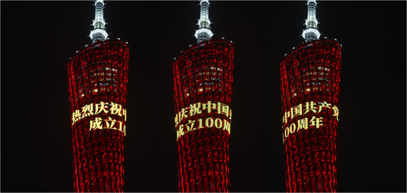 百年建党史,百年峥嵘路。为了把中国共产党百年奋斗的光辉历程和历史成就以更加生动直观的形式展现出来,入夜,广州以天空为画布,以“奋斗百年路永远跟党走”为主题,在“一带两轴三节点”1.5公里的建筑立面上演灯光秀:广州塔“深情讲述”红色故事,跨江9桥点亮“红色足迹”,中信广场与广州塔“巅峰相望”演绎红色精神,沿江24栋建筑展开“老城市、新活力”长卷,琶洲人工智能和数字经济试验区“绽放”新时代精彩。
