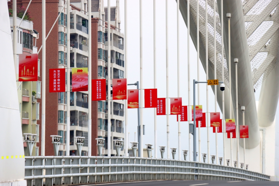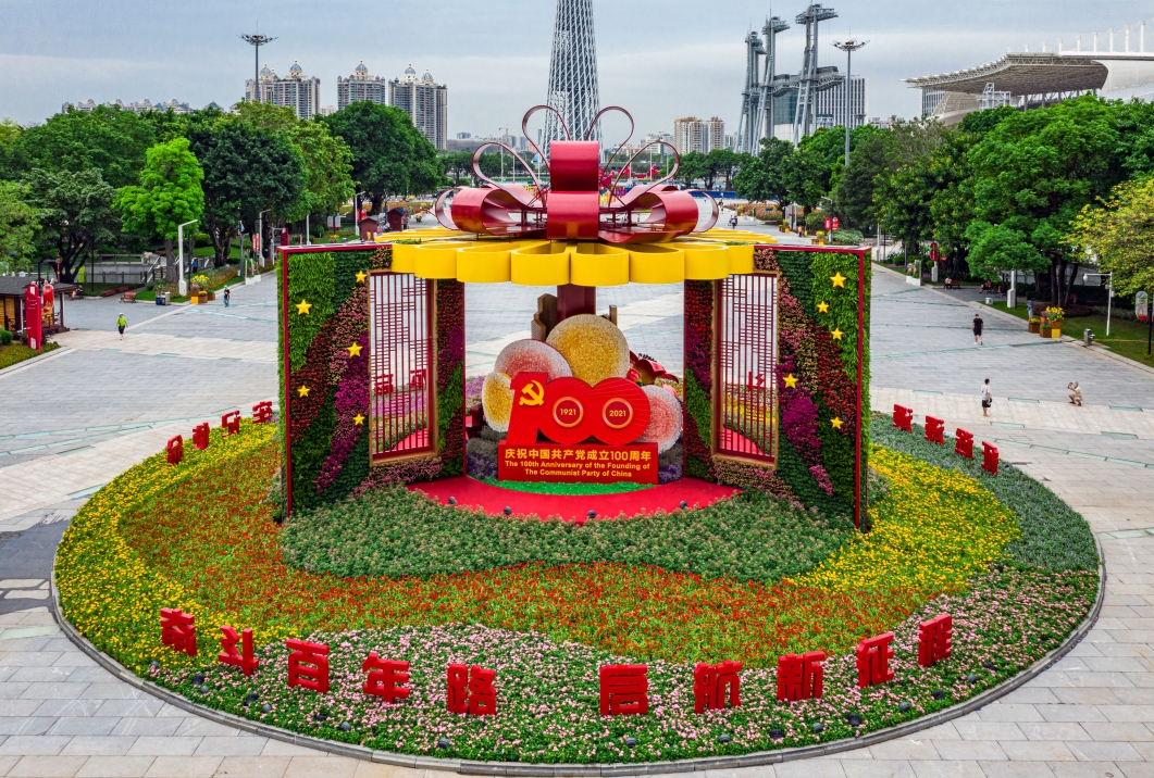 此外,全市还有七百里空中花廊、20万平方米时花欣欣向荣、花团锦簇。在二沙岛、机场高速以及城市绿地等处,“同心向党同心出发”“高举旗帜”等主题的花坛花景生动展现“云山珠水、吉祥花城”新貌,满城花影奏响赓续红色血脉的强音。
