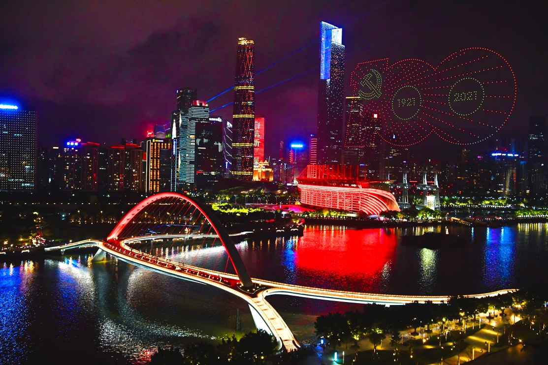 配合灯光秀,1520架无人机自海心沙腾空而起,描绘“红船起航”“三大召开”“广州起义”等重要历史事件,让城市会客厅熠熠生辉。黄埔区、南沙区、海珠区也分别上演灯光秀和无人机表演,展示“永远跟党走”的视觉盛宴。广州塔、媒体港“智”屏、海心沙“帆”屏、城市“公信屏”等城市地标为“双百人物”“重要英雄模范”和“七一”勋章获得者亮灯,向他们致以崇高敬意。