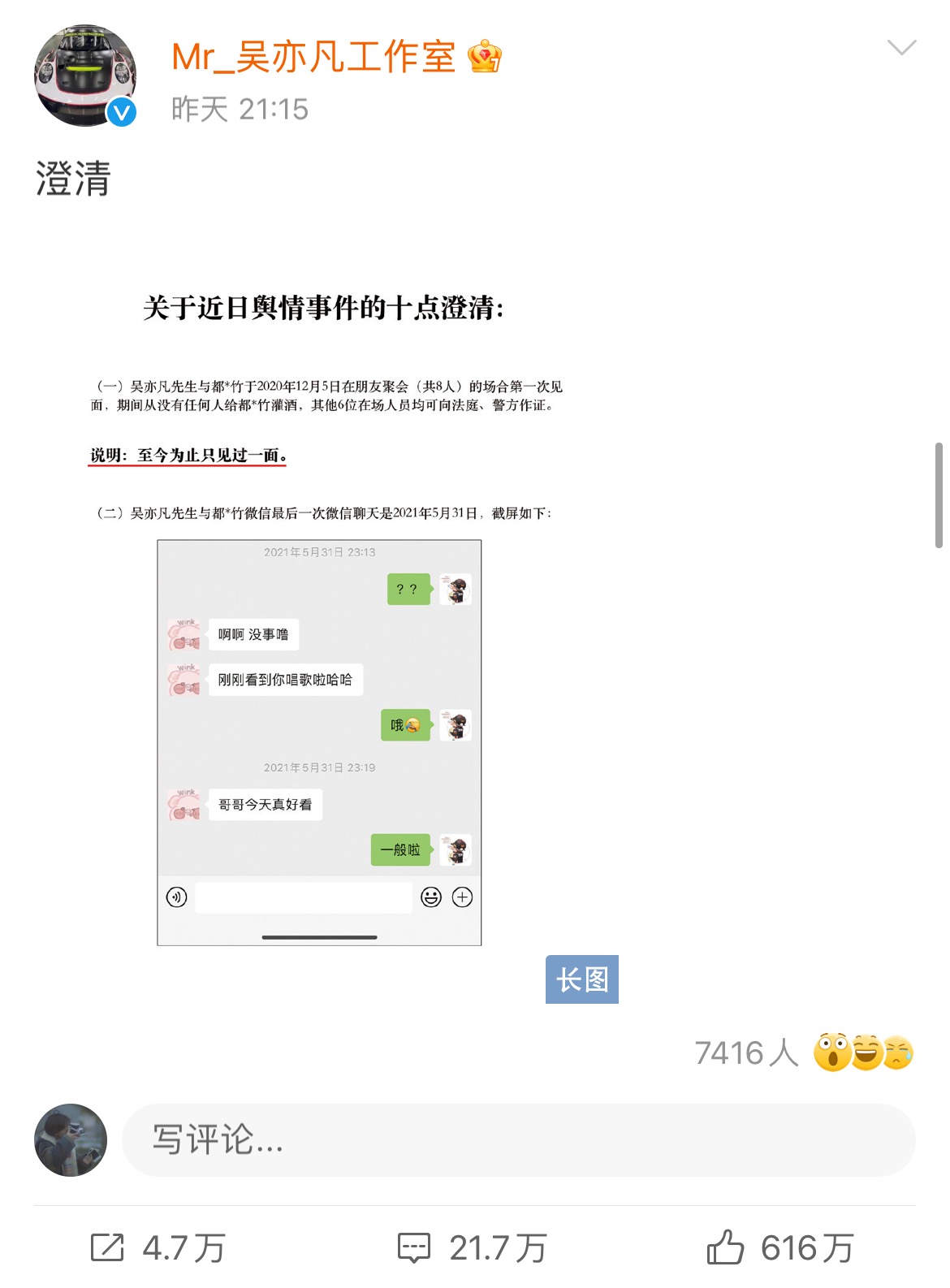 针对目前的舆情事件,吴亦凡工作室已于21时15分发出十点澄清,记者发现以下关键的几点: