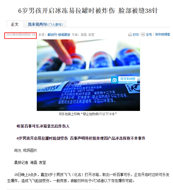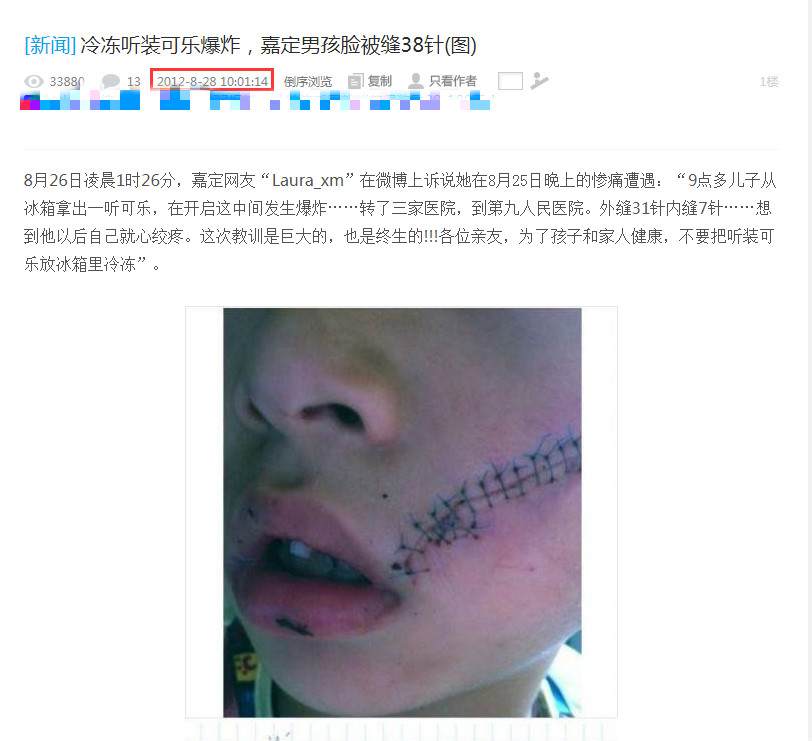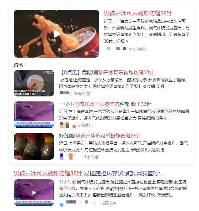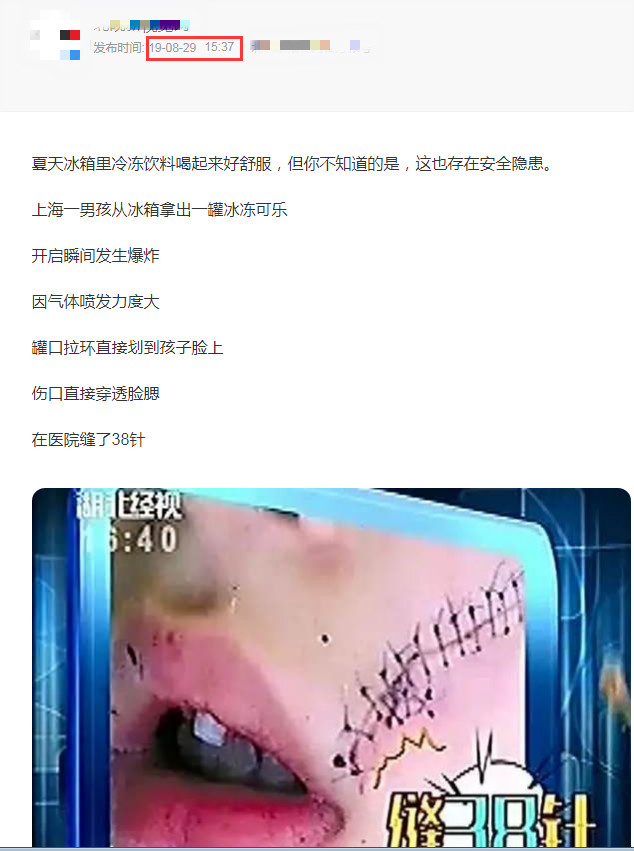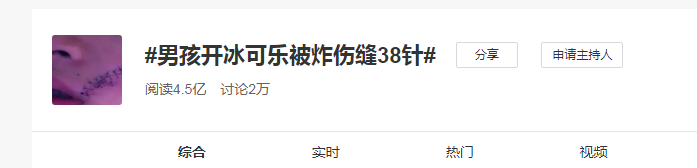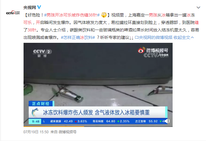 标题为“好危险!#男孩开冰可乐被炸伤缝38针# ”