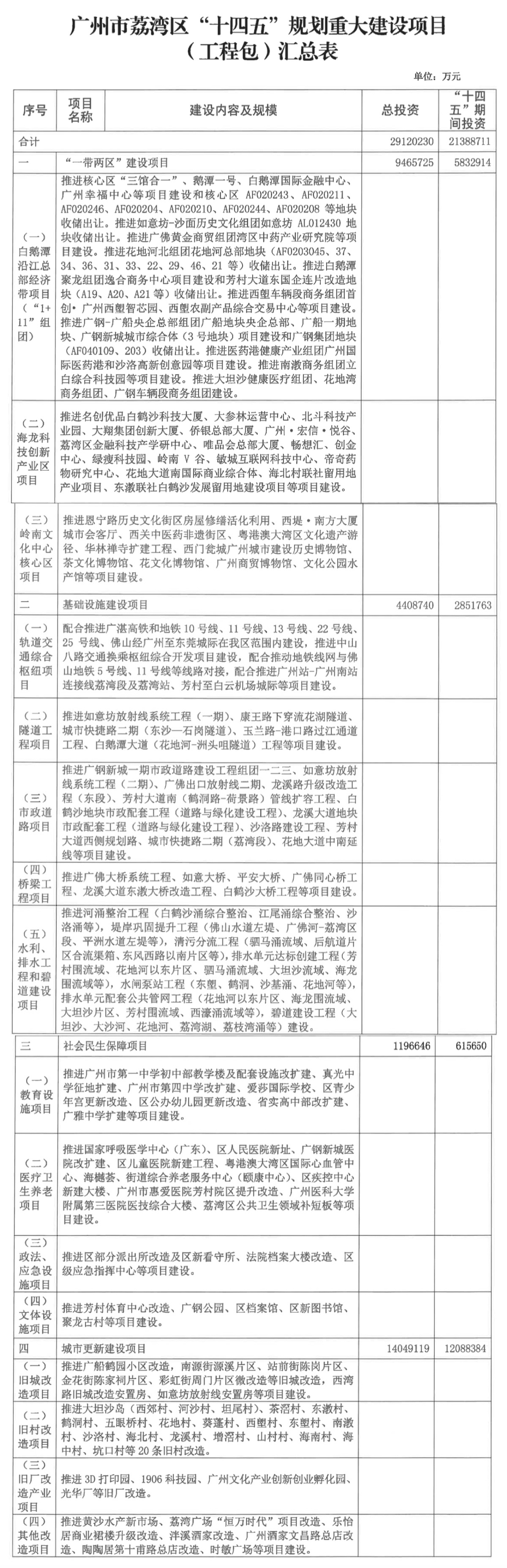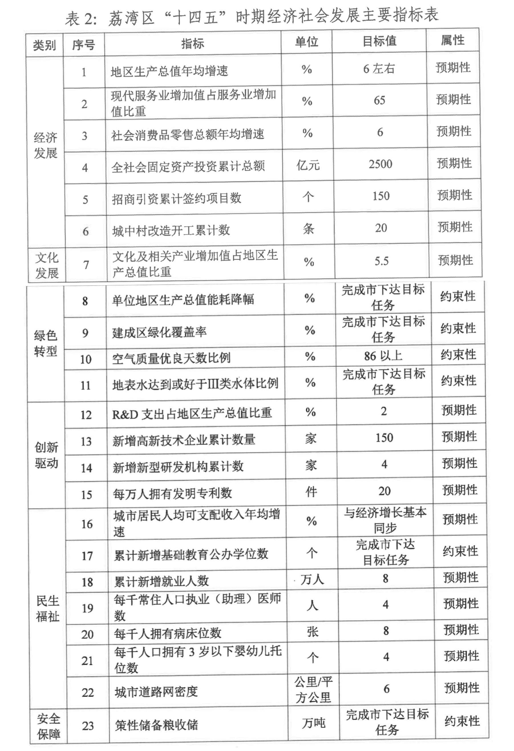 纲要提到,荔湾作为广州高质量发展的重要支撑点、核心功能区,在全市发展大局中要脱颖而出,成为重要增长极。对于今后五年全区经济社会发展要努力实现的主要目标,纲要提到,“十四五”时期地区生产总值年均长6%左右,2025年达到1450亿元左右。全社会固定资产投资累计达到2500亿元。经济结构不断优化,产业基础高级化、产业链现代化水平明显提高,加快形成以总部经济、现代商贸、医药健康、文化创意、数字经济为引领的高端高质高新现代产业体系。创新能力显著提升,R&D支出占地区生产总值比重达到2%,新增高新技术企业累计数量达到150家,新增新型研发机构累计达到4家,每万人拥有发明专利数达到20件。招商引资取得新突破,累计签约项目数达到150个。城中村改造全面铺开,开工累计数达到20条。