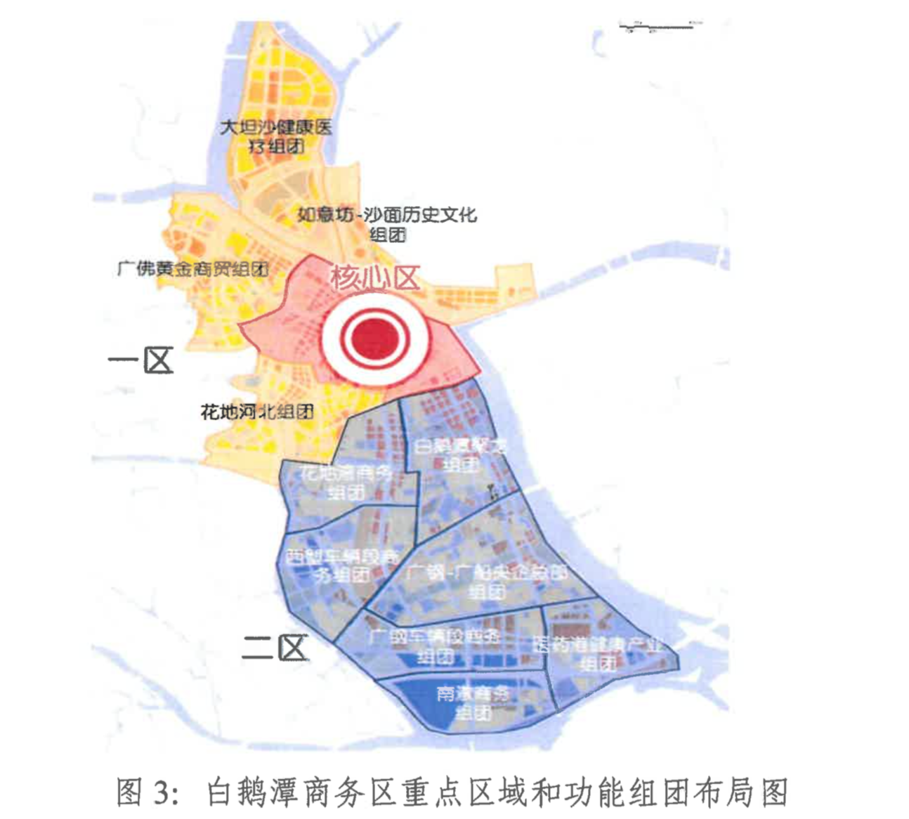 加快推进白鹅潭商务区北片区建设。北片区为白鹅潭核心区以北的组团,包括大坦沙健康医疗组团、如意坊一沙面历史文化组团和广佛黄金商贸组团,片区现状主要为传统村居和历史文化街区。未来要通过对大坦沙健康医疗组团的整体改造和如意坊一沙面历史文化组团、广佛黄金商贸组团的优化提升,重点发展现代商贸、医药健康、文旅创意等产业。