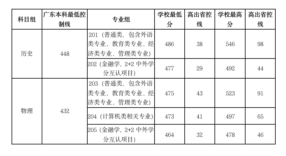 在物理科目组中,其中专业组203(普通类,包含外语类专业、教育类专业、经济类专业、管理类专业)最高分为523分,超出广东省本科最低控制分数线91分,最低投档分为475分,超出广东省本科最低控制分数线43分;专业组204(包含计算机类相关专业)最高分为497分,超出广东省本科最低控制分数线65分,最低投档分为473分,超出广东省本科最低控制分数线41分;专业组205(包含金融学,2+2中外学分互认项目)最高分为478分,超出广东省本科最低控制分数线46分,最低投档分为464分,超出广东省本科最低控制分数线32分。