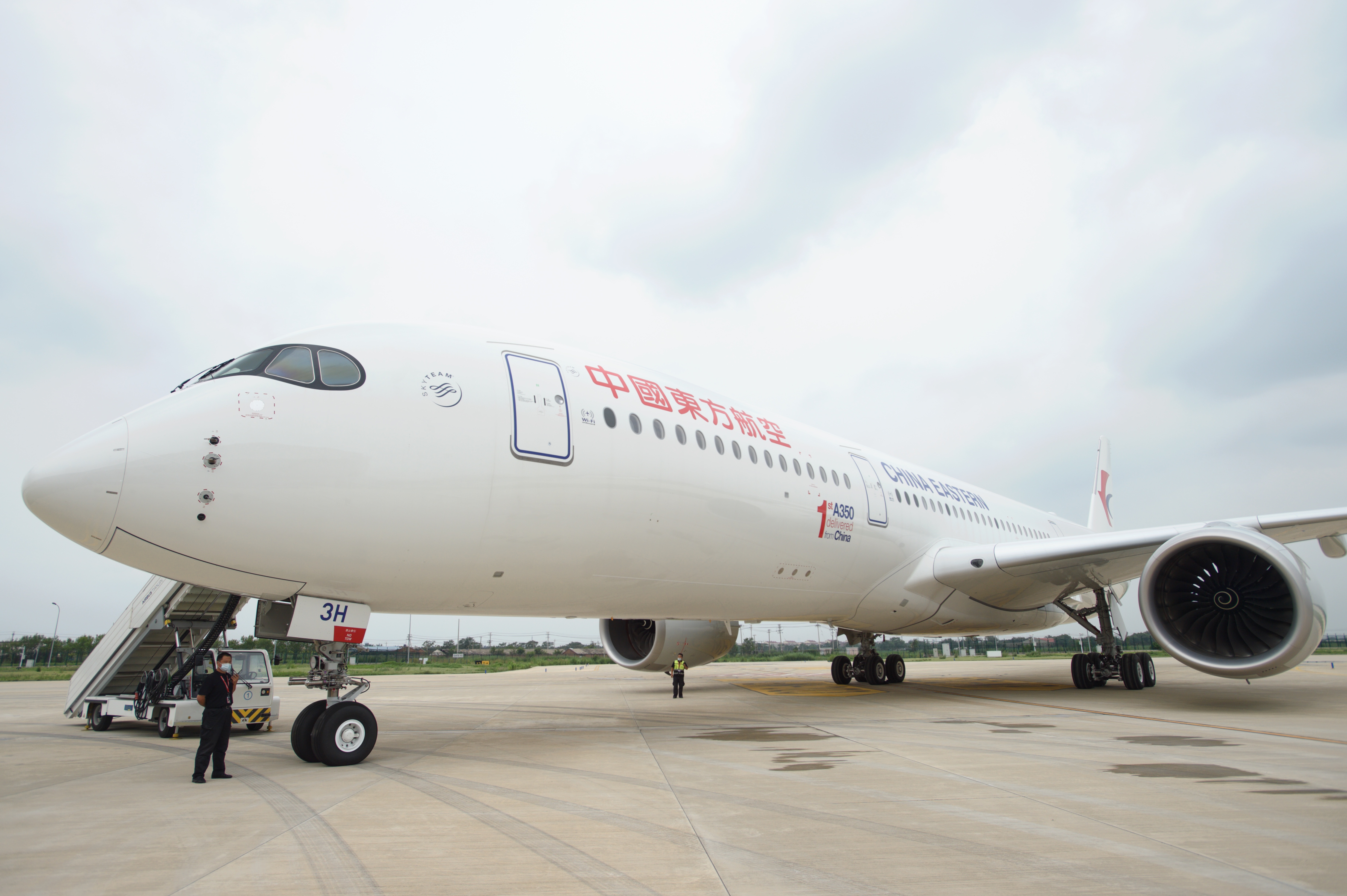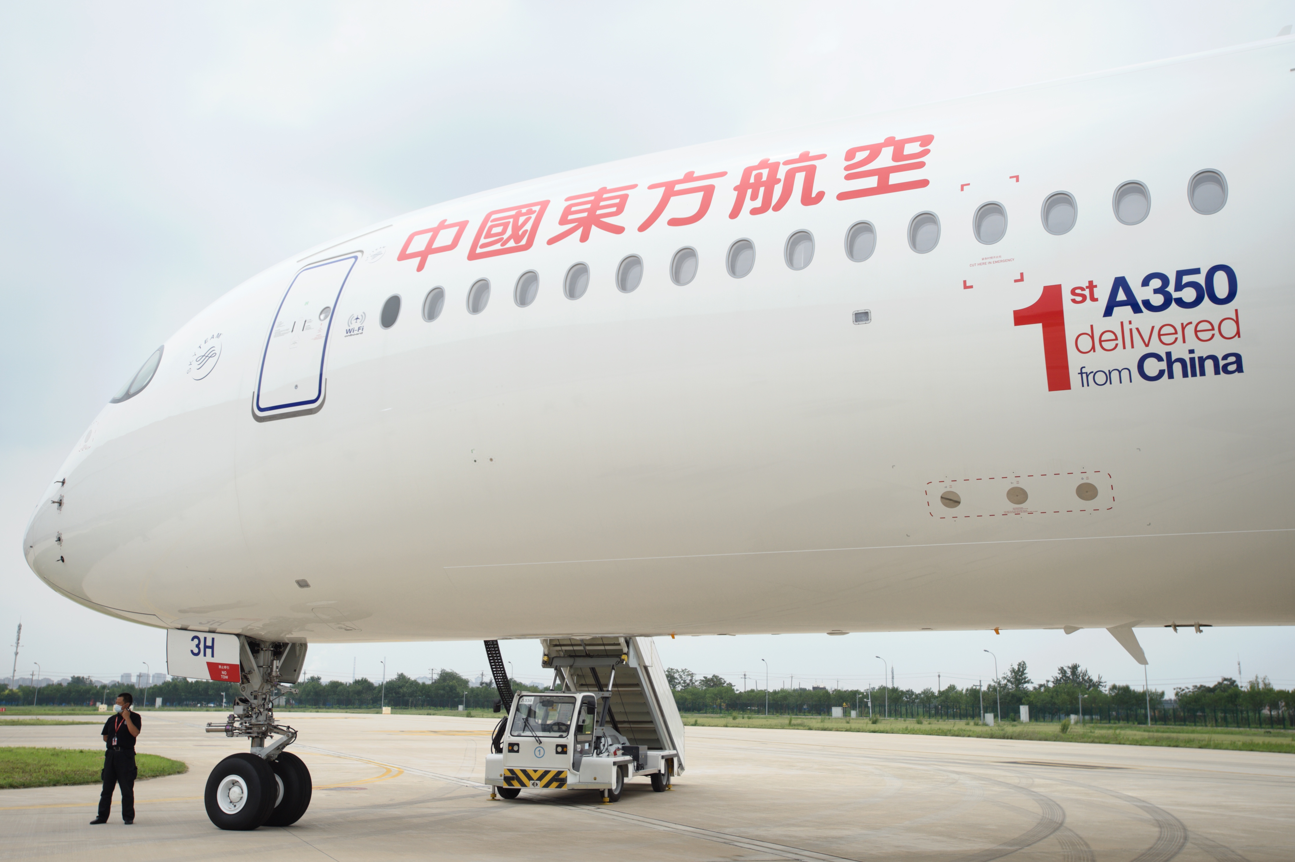 这架编号为B-323H的空客A350-900飞机,机身上喷涂“1st A350 delivered from China”(第一架由中国交付的A350)。今年4月21日从法国图卢兹飞抵天津,在这里进行包括客舱安装、生产飞行测试等后续环节,7月21日正式交付东航加入东航机队,是东航订购的20架A350飞机之中的第10架。
