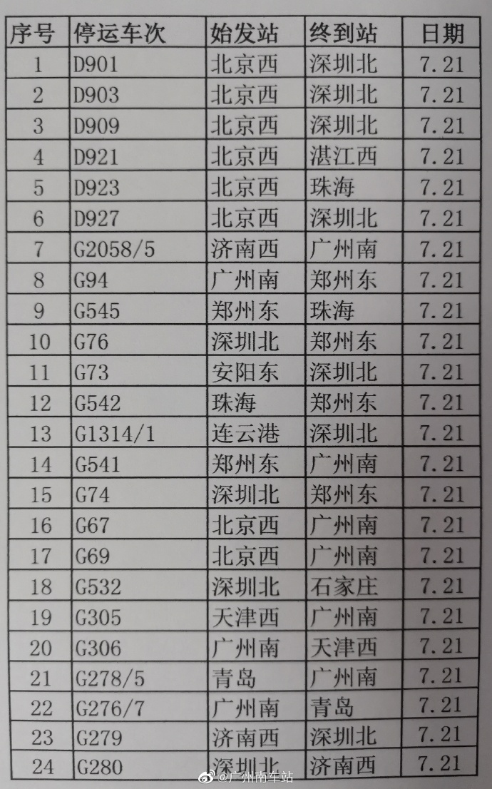 受河南多地持续强降雨天气影响,截至7月21日上午10:00,广州南站列车停运车次: